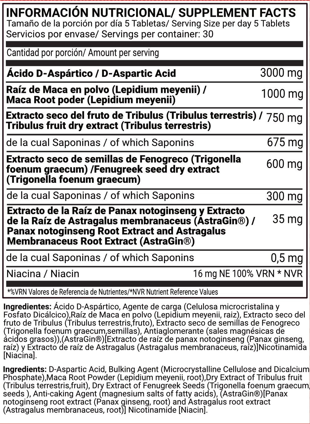 Ingredientes: Ácido D-Aspártico, Agente de carga (Celulosa microcristalina y Fosfato Dicálcico),Raíz de Maca en polvo (Lepidium meyenii, raiz), Extracto seco del fruto de Tribulus (Tribulus terrestris,fruto), Extracto seco de semillas de Fenogreco (Trigonella foenum graecum,semillas), Antiaglomerante (sales magnésicas de ácidos grasos)),(AstraGin®)[Extracto de raíz de panax notoginseng (Panax ginseng, raíz) y Extracto de raíz de Astragalus (Astragalus membranaceus, raíz)]Nicotinamida, Niacina.